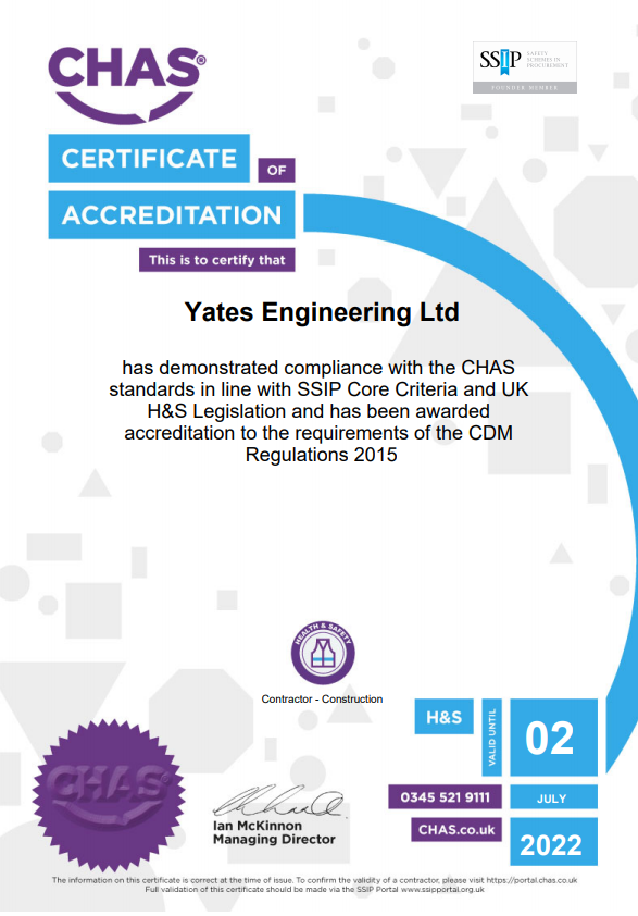CHAS (The Contractors Health and Safety Assessment Scheme) was created by experienced health and safety professionals in 1997 to improve health and safety standards across the UK. You’ll find Yates Engineering registered in the CHAS scheme national database.